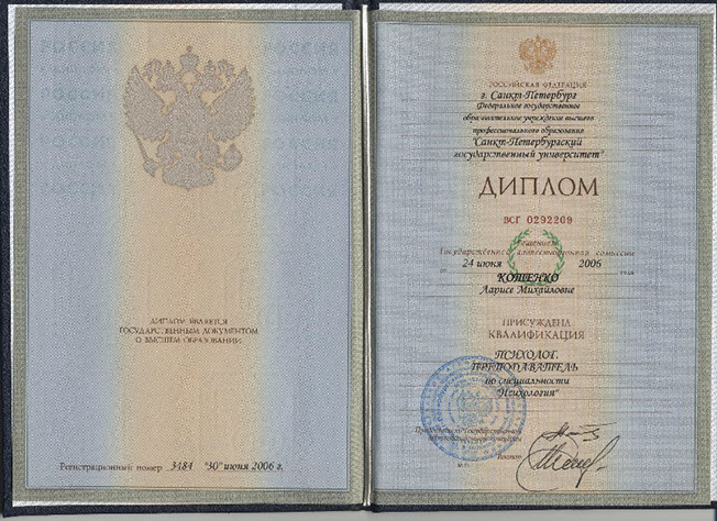 - Санкт-Петербургский Государственный Университет, факультет психологии – психолог. Преподаватель психологии.