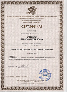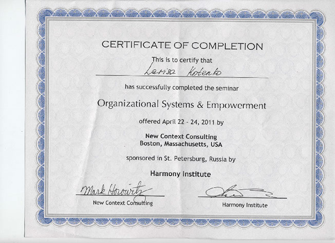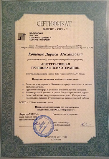 - Более 1400 часов курсов повышения квалификации по индивидуальной, семейной, детской психотерапии, тренерской работе и работе с организациями, диагностике.
