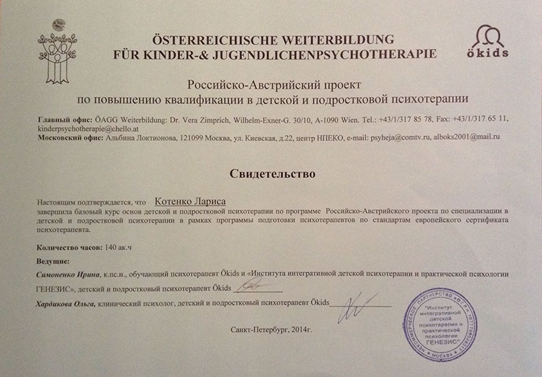 - Австрийский институт повышения квалификации ÖKids - детский психотерапевт;